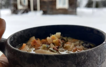 Helppo ja maistuva retkiruoka, jonka voit valmistaa vaikka retkikeittimellä tai miksipä ei ihan kotioloissakin. Tuote sisältää Savukosken Kemin-Sompion palkisen poronlihaa lämminsavustettuna, Lapin kaskinaurista sekä porkkanaa ja perunaa. Liemen maustajana toimivat useat erilaiset yrtit sekä laadukas reformin lihaliemijauhe (luomu).
